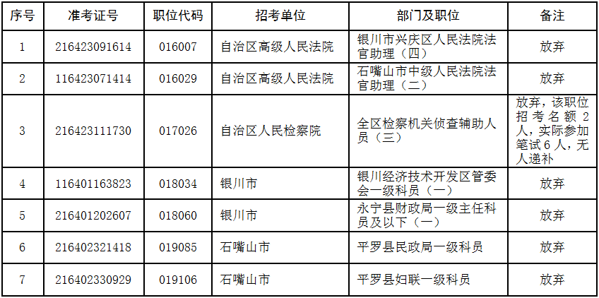 2026年全區(qū)考試錄用公務員第一批次面試人員名單發(fā)布2日內(nèi),有個別考生自愿放棄面試資格。根據(jù)《寧夏回族自治區(qū)2026年考試錄用公務員公告》相關規(guī)定,面試空缺名額由報考同一職位且筆試成績在合格分數(shù)線以上的報考者從高分到低分依次遞補?,F(xiàn)將有關情況公告如下: